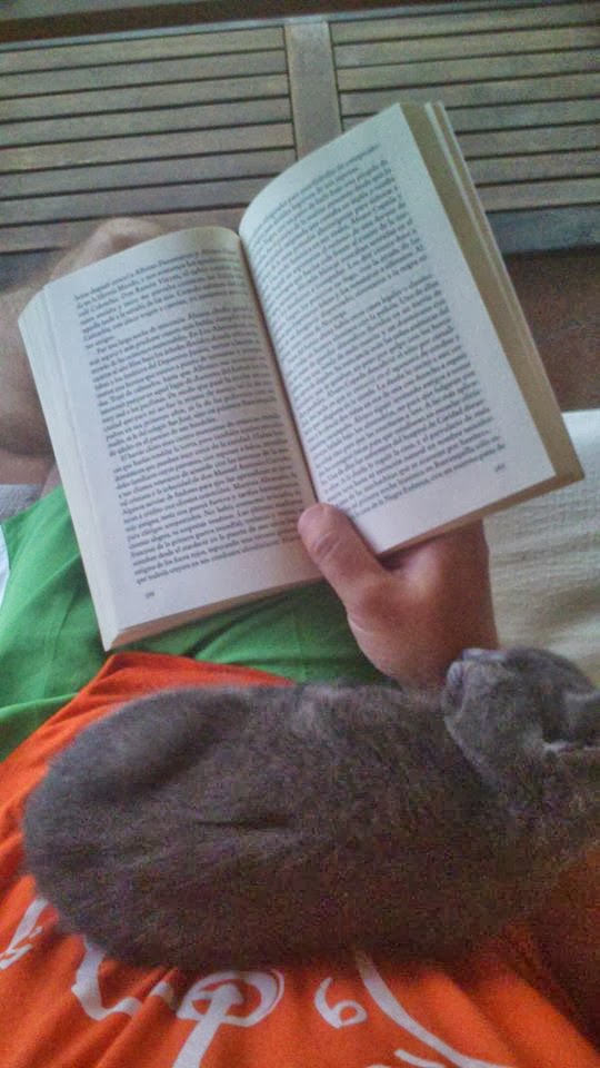 Històries de la GATA ALEGRE I COMBATIVA (Segona part). Ella vol escriure i llegir...I jo, com que sóc mestre d'escola haurè d'ensenyar-la... Encara que sembla saber-ne molt ja d'això. No pot deixar d'intentar posar les potetes damunt el teclat i quan agafe el llibre, ella vol precís posar-se a llegir amb mi. Passe el full, mos al dit...! Clar, igual ella encara no havia acabat el paràgraf,que jo vaig molt apressa... Què en se jo?. Em pose a inventar històries amb el quadern i la llapissera... Ella, mos al dit!!!... que sembla tenir enveja dels moviments nerviosos de la ma quan escriu... o què en se jo?. Finalment ens comprendrem molt be ella i jo... Si, sembla que li agraden les mateixes coses que a mi desprès de tot: Becar panxa en amunt a la maca del terrat, menjar rosquilletes, i llegir i llegir fins que la fosca ens fa alçar-nos, per fi...